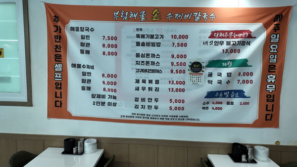 ‘주당파들’의 해장 메뉴로 얼큰 칼제비가 단연 인기이며, 주인은 굴국밥, 갈미만두를 강력 추천한다.